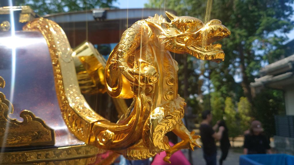 汚れが目立っていた屋根の銅板は漆で塗り直され、飾り等も金で塗装し直し見違える程の姿となりました。