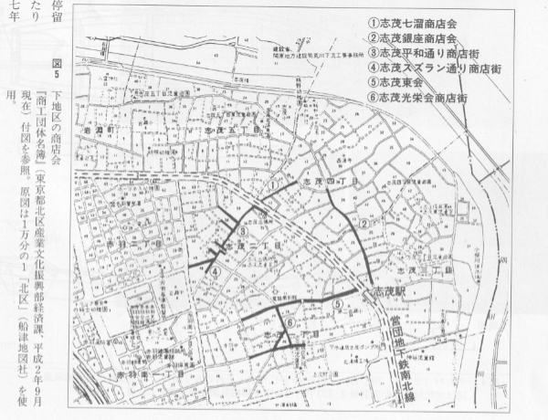 志茂地域にはかって志茂光栄会商店街、志茂東会、志茂銀座商店会、志茂七溜商店会、志茂平和通り商店街、志茂スズラン通り商店街の六つの商店会がありました。 これらの商店会の場所を地図上で示します1)。